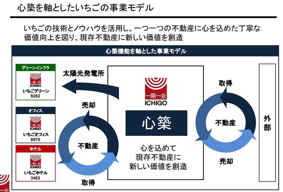 いちごは現存する不動産に付加価値をつけて売却する「心築事業」を核とする不動産企業です。