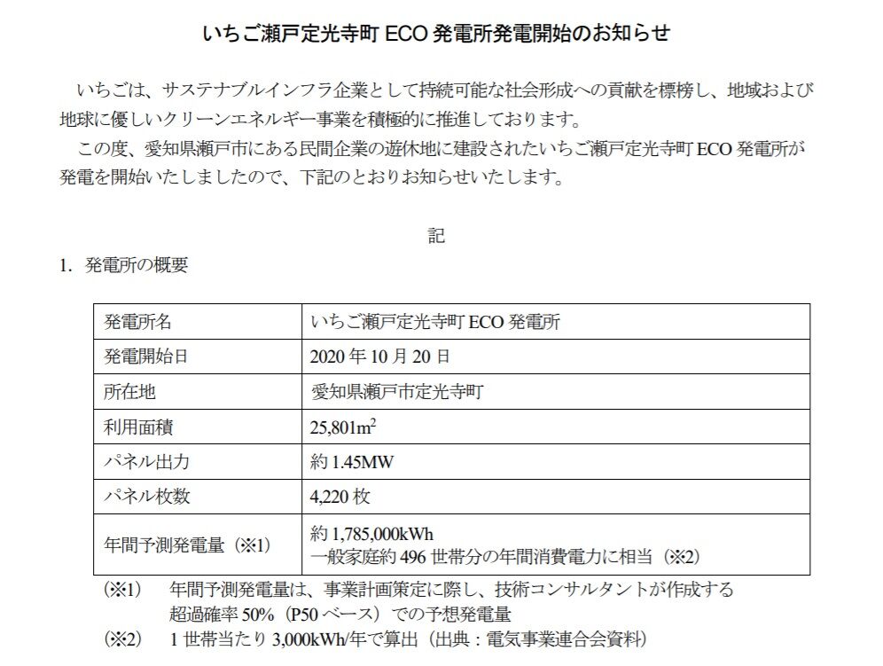 いちご瀬戸定光寺町ECO発電所が発電を開始したと発表しました。