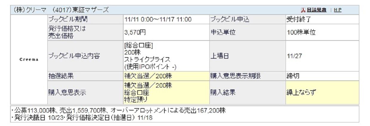 子どもと妻口座で500株が補欠当選となっていたIPOクリーマですが、見事に全て落選となりました。笑