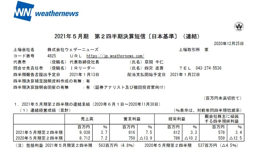 【4825】ウェザーニューズが12月25日に2021年5月期第2四半期決算を発表しました。