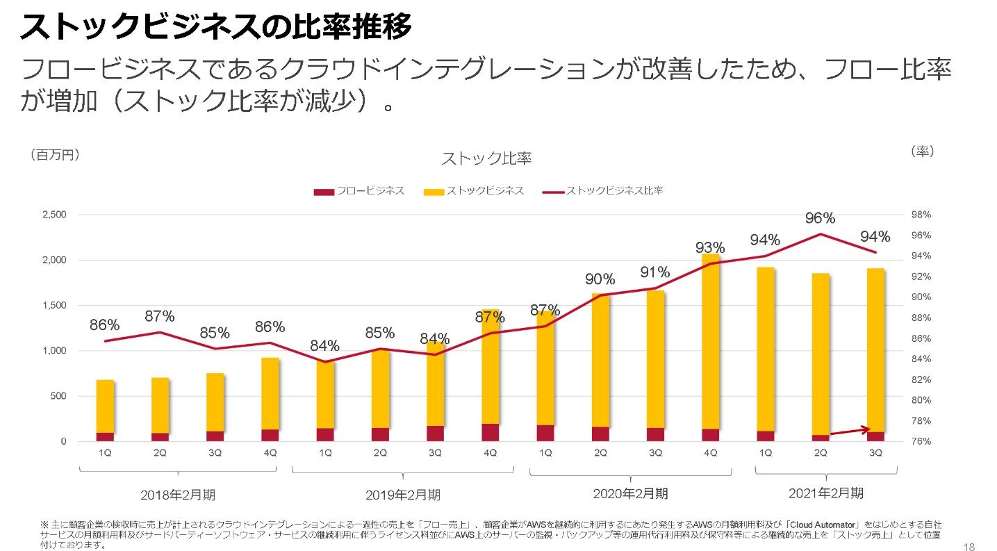 AWSの利用料金や自社サービス利用料金、保守管理料などの多くはストック収益であり、ストック比率の高さがサーバーワークスの特徴となっています。
