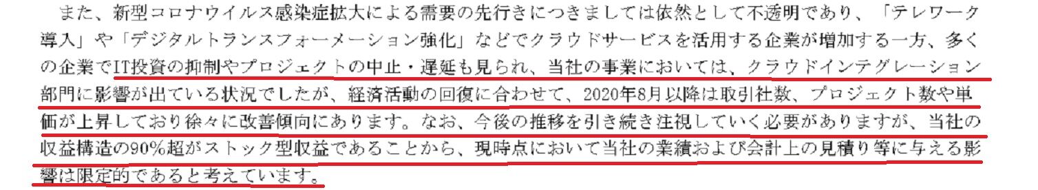 クラウドインテグレーションはコロナ禍の影響による営業活動の停滞などの影響で売上が減少しています。