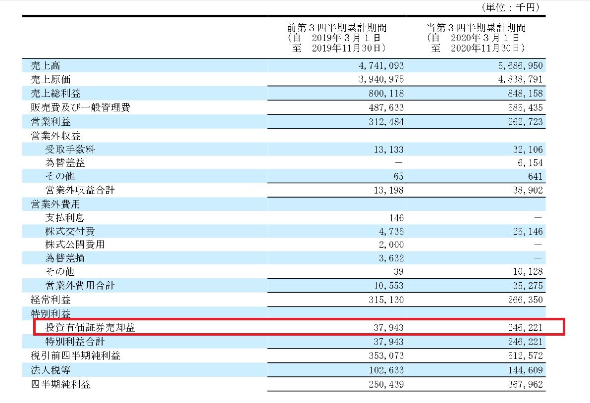 営業利益約2.6億円に対して、有価証券売却益が2.4億円以上ありますので特別利益のインパクトはかなり大きくなっています。