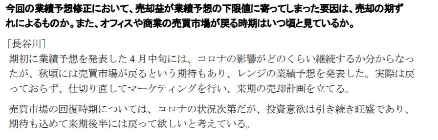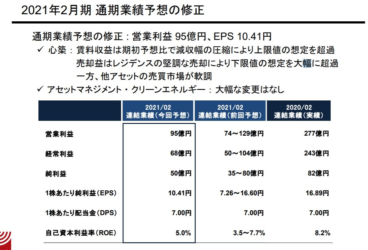 新型コロナウイルスの感染が再拡大する中での業績予想修正となりましたので、ホテル収益などについてはかなり保守的に積算していると思われます。