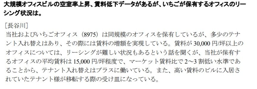 いちごの保有するオフィス物件の賃料は相場に比べて低く、テナントによる入替はプラスに働いており、高賃料のオフィステナントの移転先として受け皿になっているとのことです。