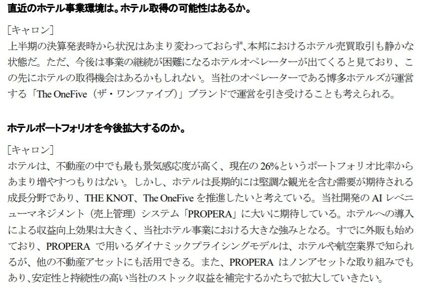 ただ、長期的なホテル事業には成長を期待しており、ホテル運営を継続できない事業者などが出てくれば取得もあるかも知れないということですね。