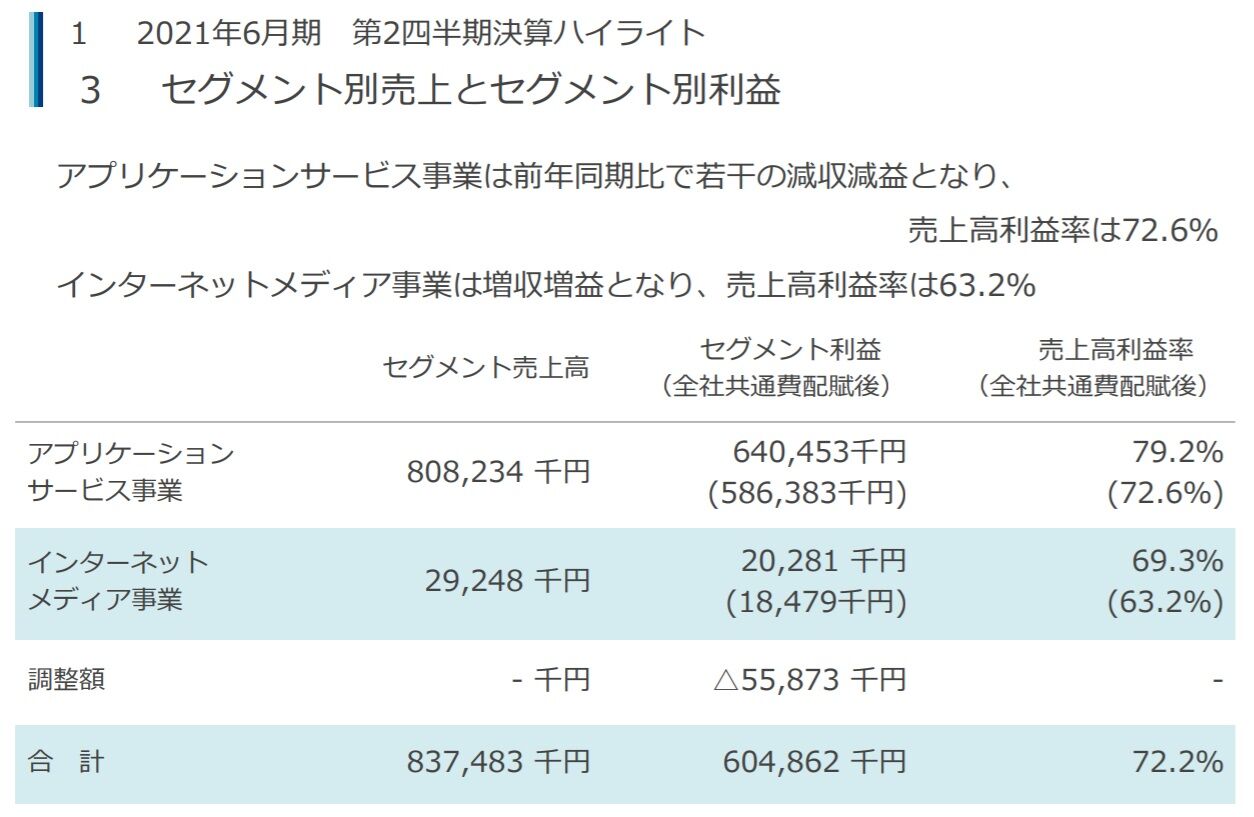 ただ、下記の通り業績の大部分はアプリケーションサービス事業によるものとなっています。