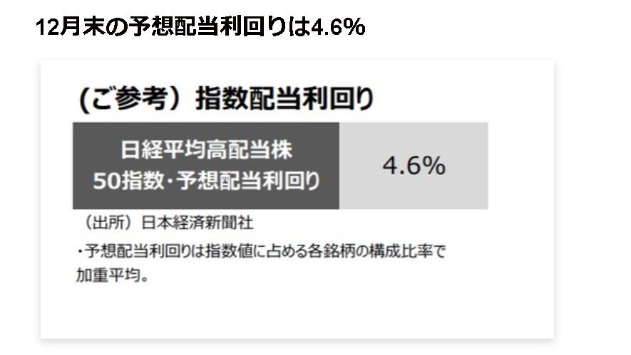 50銘柄に分散されていることを考えれば悪くはない配当利回りですが、12月末時点の予想配当利回りは下記の通り4.6%だったのでかなり低下していますね。