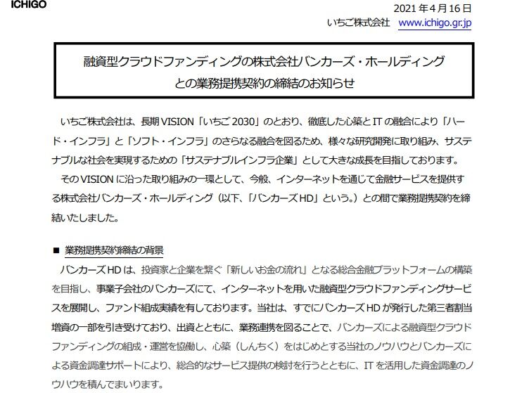 【2337】いちごは融資型クラウドファンディングのバンカーズHDとの業務提携を発表しました。