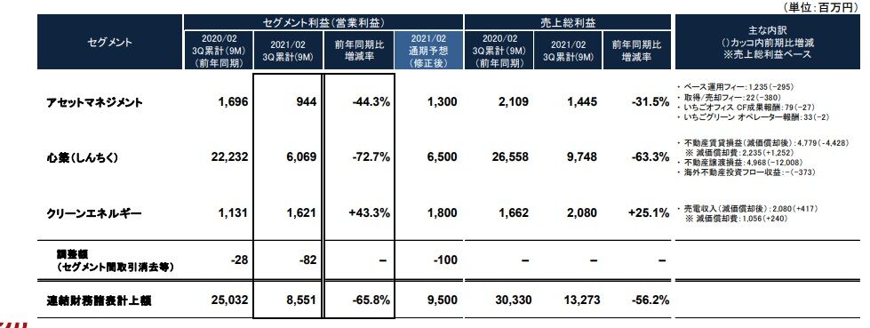 REITやグリーンインフラを傘下に持ち、多様な売却先・アセットタイプを扱う点が強みとなっていますが、コロナ禍の影響を強く受けており前期、今期と苦しい状況が続いています。