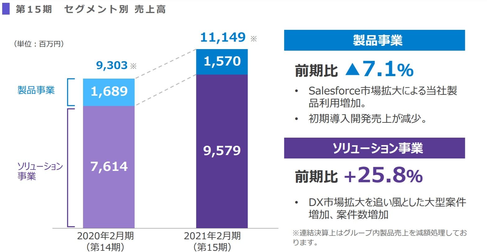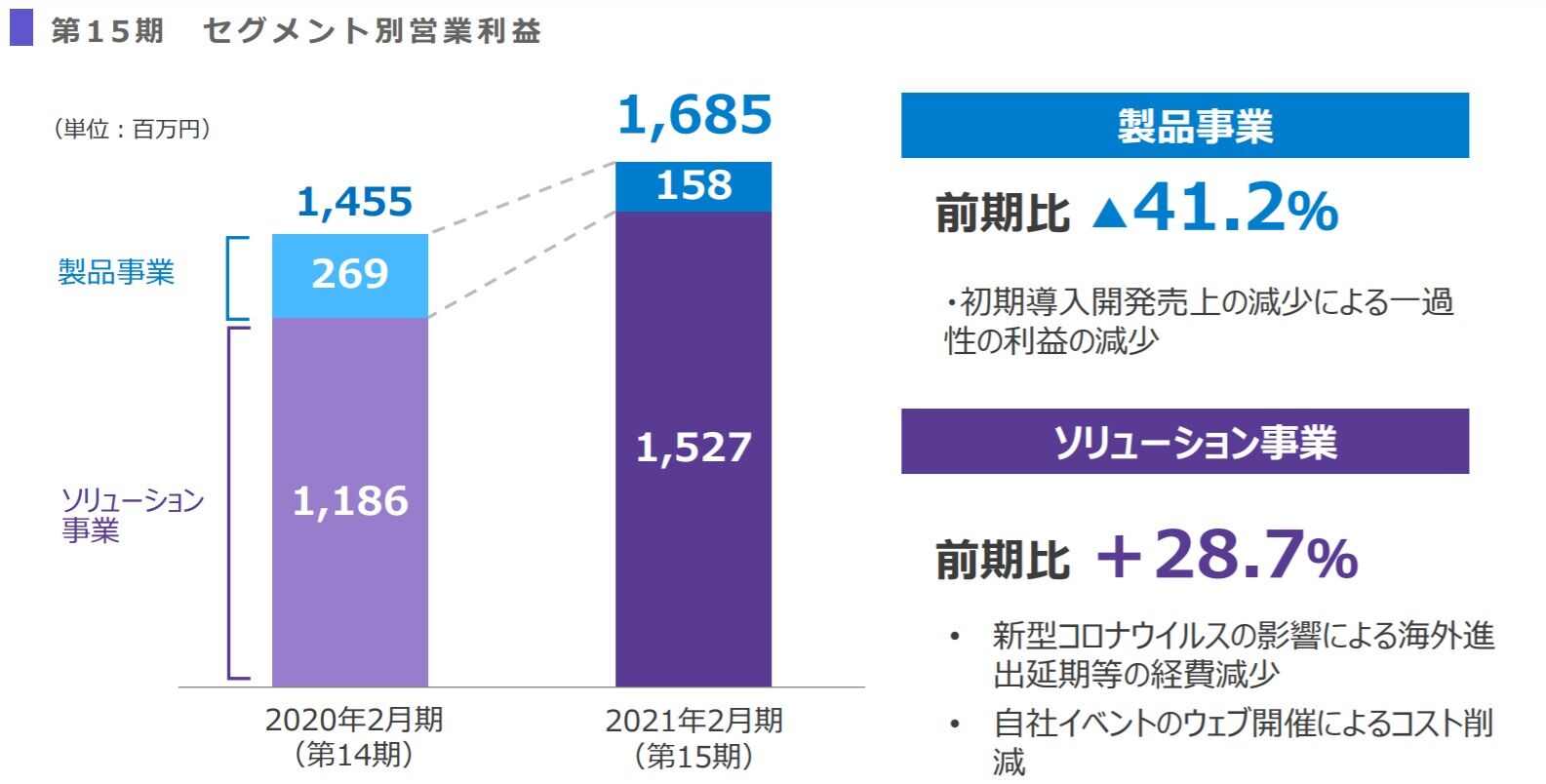 クラウド化の需要が高まっており、ソリューション事業は高成長していますが、製品事業は初期導入開発売上が減少したため減収となりました。