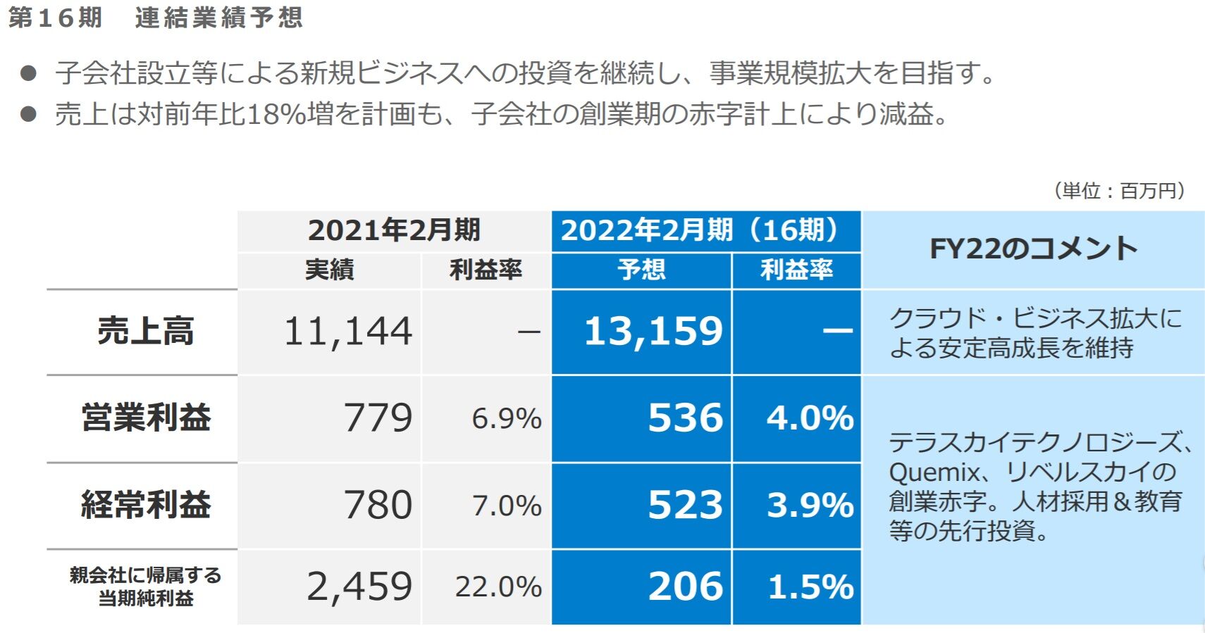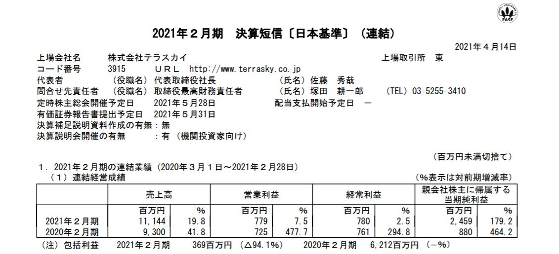 4月14日に【3915】テラスカイが2021年2月期本決算を発表しました。