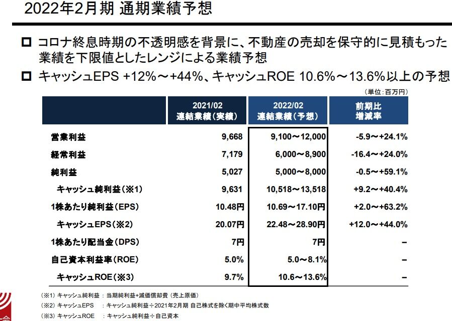 コロナ禍の影響次第でホテル収益などが大きく変化するため前期に引き続きレンジ予想です。
