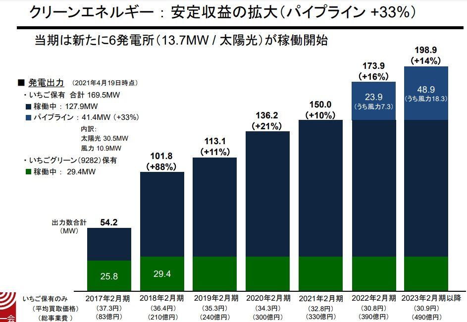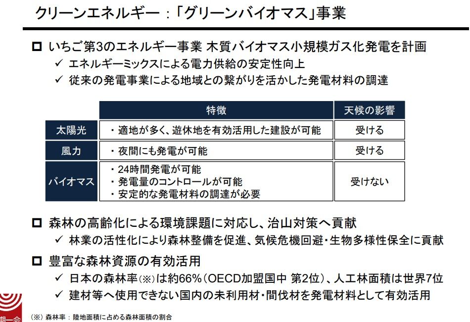 クリーンエネルギー事業の主力は太陽光発電ですが、風力発電を今年稼働させており、上記の通りバイオマス発電の開発も計画しているとのことです。