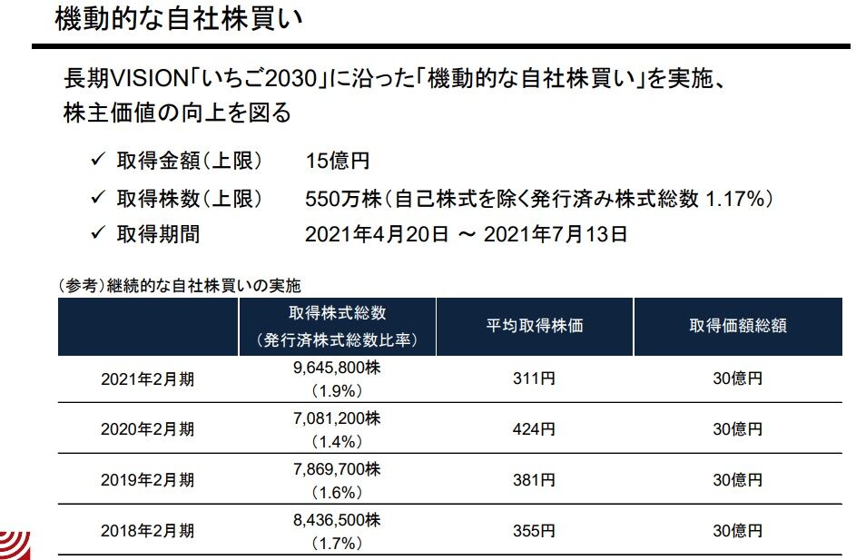 いちごの自社株買いを5期連続となり、過去4期は30億円規模の自社株買いとなっていますので、今期も株価が株安だと判断すれば今回の自社株買いと同規模の自社株買いが期待できそうですね。