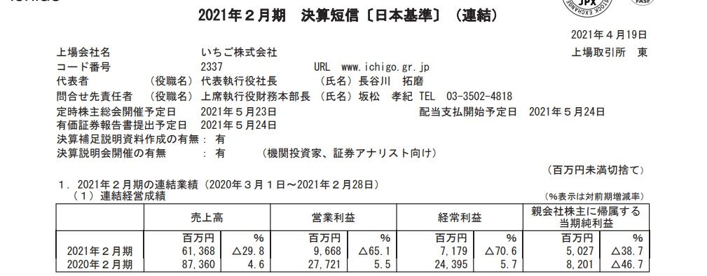 私が保有する個別株銘柄の中で割合が一番大きい【2337】いちごが4月19日に本決算を発表しました。