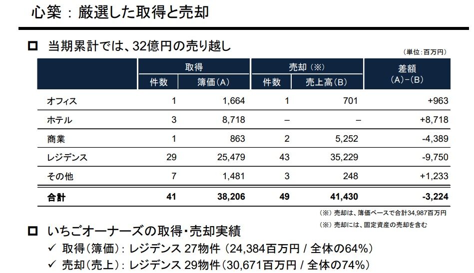 取得・売却ともに中心となったのはレジデンス(いちごオーナーズ)です。