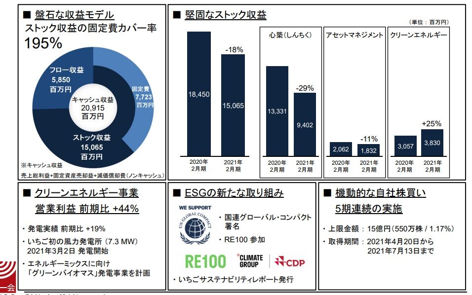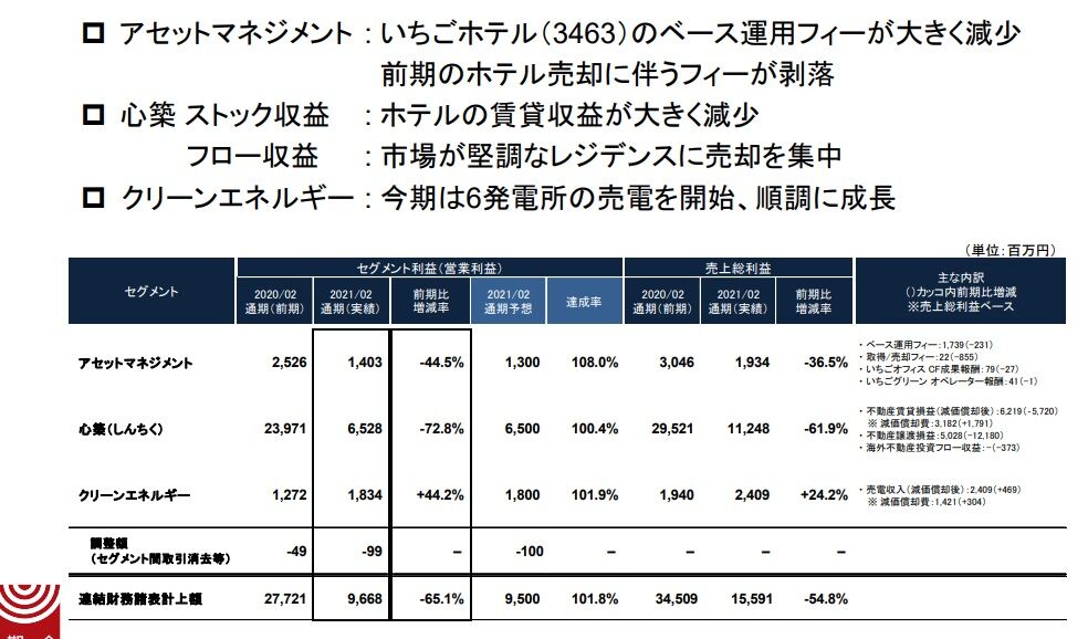 決算説明会でも説明がありましたが、ホテルの賃貸収入は4分の1程度と大幅に減少したようですがストック収益全体ではそこまで落ち込みませんでした。