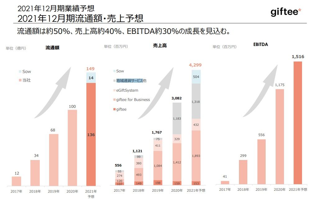 2019年12月期までは売上の大部分を法人のキャンペーン向けなどのサービスである「giftee for Business」が占めていましたが、前期から地域通貨サービスが急拡大しています。