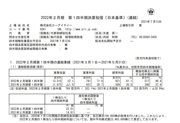 【9381】エーアイテイーが7月13日に第1四半期決算を発表しました。