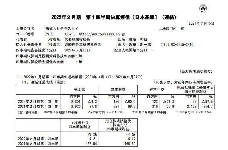 7月15日に【3915】テラスカイが2022年2月期第1四半期決算を発表しました。