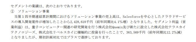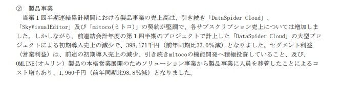 ただ、この反動があるのはテラスカイ全体の売上高の10数パーセントに過ぎない製品事業の話です。