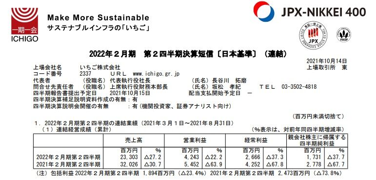 10月14日に【2337】いちごが2022年2月期第2四半期決算を発表しました。