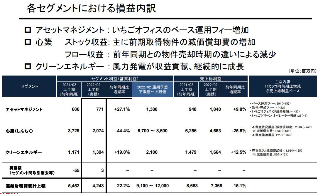 アセットマネジメント事業やクリーンエネルギー事業は前期比で大きく伸びており、コア事業の心築事業(不動産再生事業)も第2四半期時点では大きく落ち込んでいますが、既に第3四半期に177億円の物件売却を予定しているからです。
