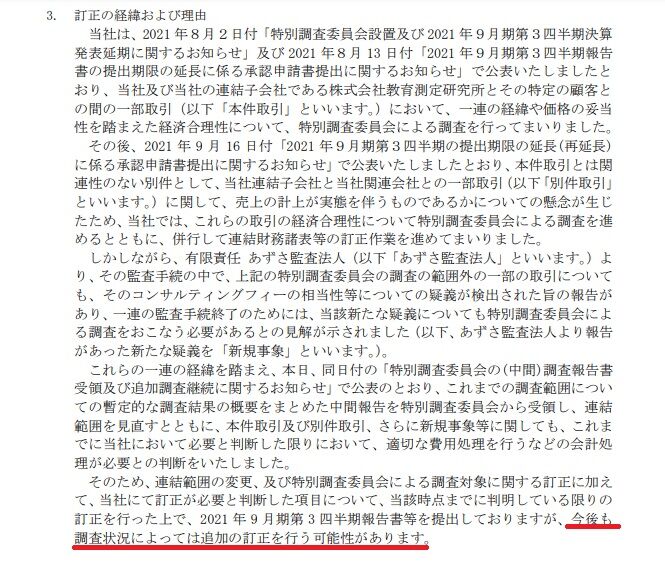 継続して行われる調査結果によっては更なる決算訂正が行われる可能性があることも以下のとおり明記されています。