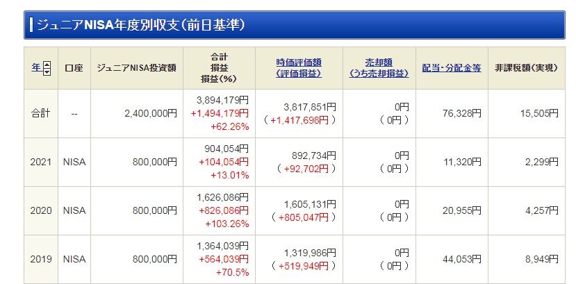 第2子のジュニアNISA口座をチェックしていたら、SBI証券ではジュニアNISA口座の年度別収支状況が確認できることがわかりました。