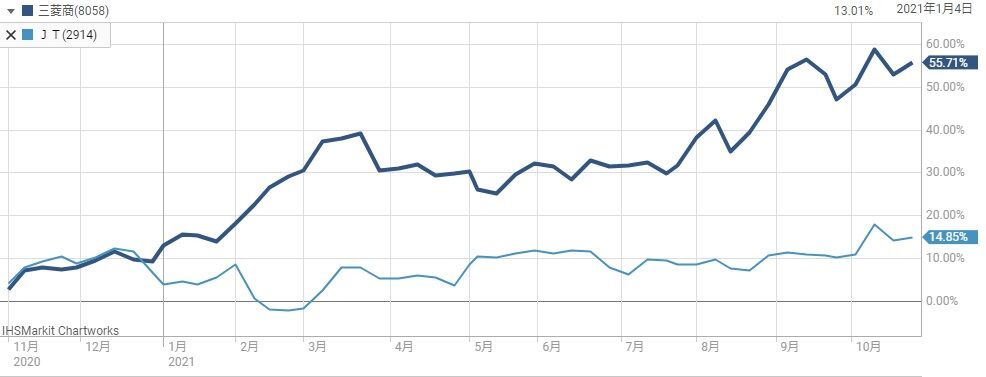 配当利回りが5%台後半となっている構成割合4位のJTとの株価推移を比較するとこうなります。