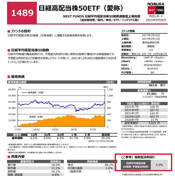 高配当株ETFである【1489】日経高配当株50ETFの9月末予想配当利回りは4.5%となりました。