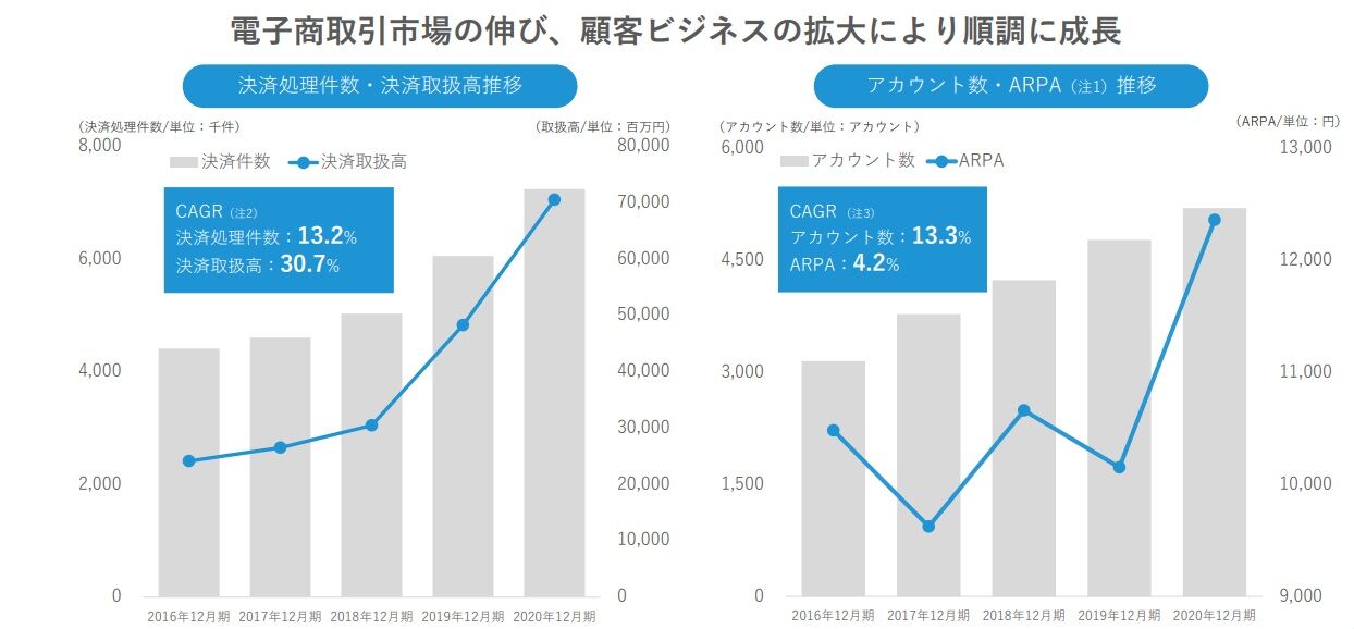 EC市場の拡大に伴い、決済件数、取扱高、アカウント数が順調に増加しています。