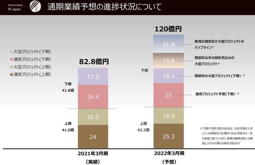 通常プロジェクトに関しては上期24億円、下期25.3億円予想とほぼ上期なみの数字ですので、大幅成長予想を達成できるかどうかは大型プロジェクト次第ですね。