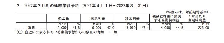そもそも下記のように今期業績予想値は売上高44.8%増、営業利益47%増と高成長予想です。