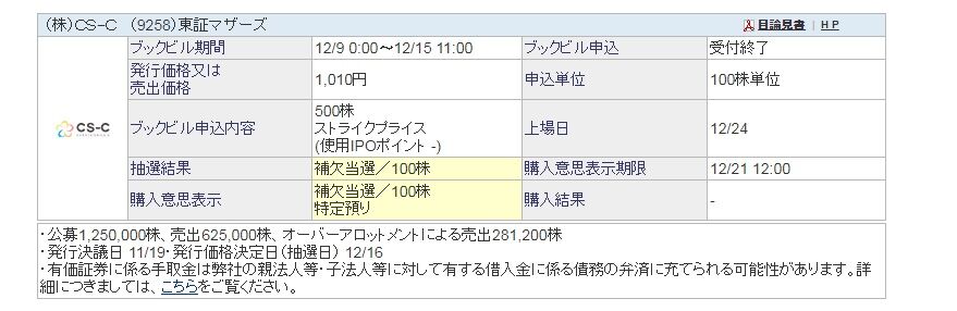 ご覧のとおりCS-CにSBI証券にて補欠当選しました