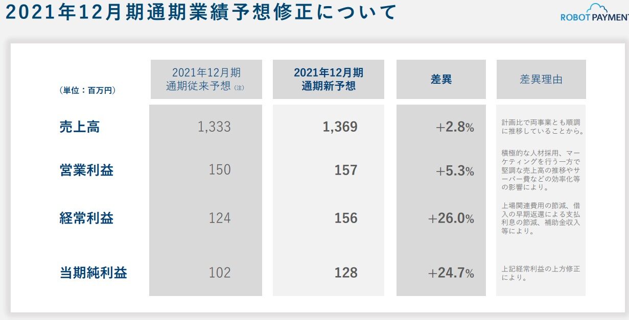 ROBOT PAYMENTは今回の決算発表に合わせて業績予想を上方修正しています。