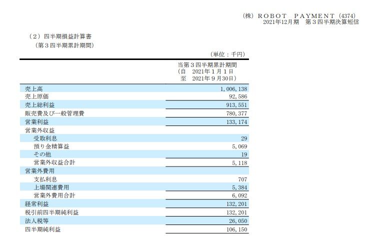 【4374】ROBOT PAYMENT(ロボットペイメント)が11月12日に2021年12月期3Q決算を発表しました。
