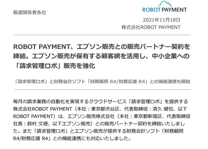 11月18日はファイナンシャルクラウド事業のサービスである請求管理ロボの販売についてエプソン販売とパートナー契約を締結したと発表しています。
