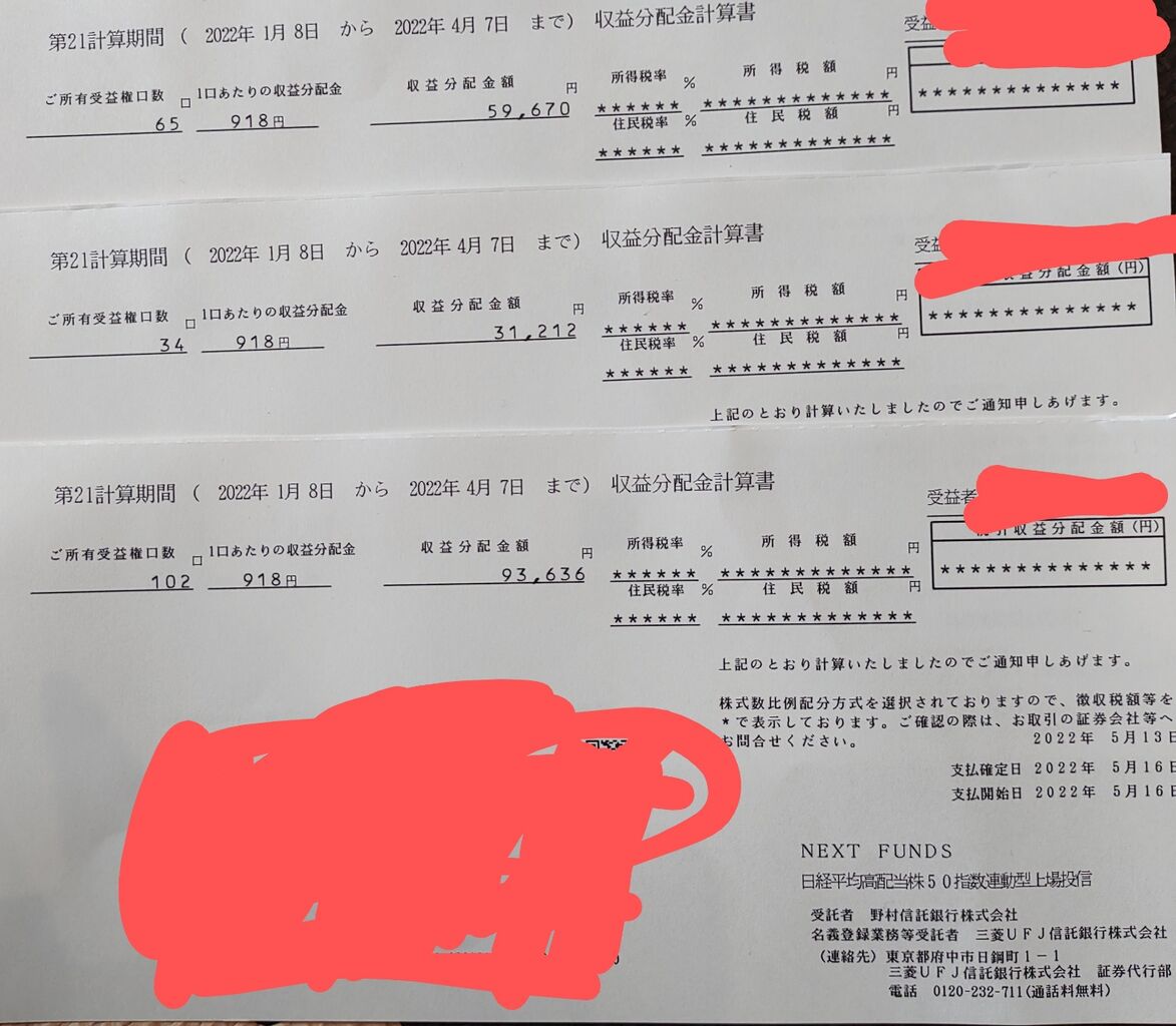 先日高配当ETFである日経高配当株50ETFより配当金(分配金)を受け取りました。