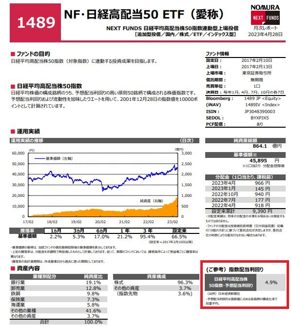 【1489】日経高配当株50ETFの月次レポートによると、4月末時点の予想配当利回りは4.9%となりました。