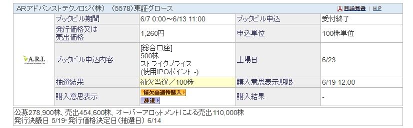 IPO銘柄のARアドバンストテクノロジに補欠当選しました。
