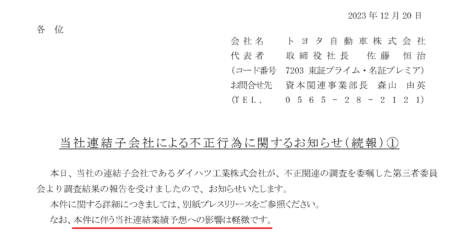 12月20日にトヨタ自動車は子会社のダイハツで発覚した不正についてIRを出しました。