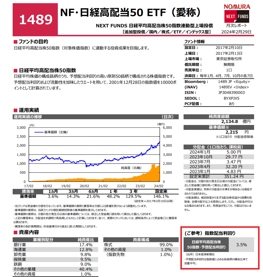 【1489】日経高配当50ETFの2月末配当利回りは3.5%となりました。