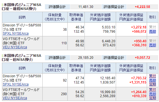 第2子のジュニアNISA口座はメインを米国株式で運用しています。