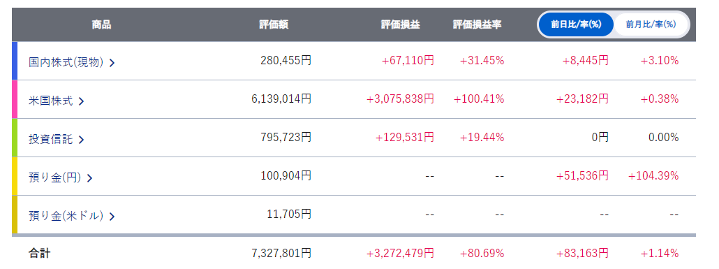 米国株式に関しては損益率が100%を超えていました。