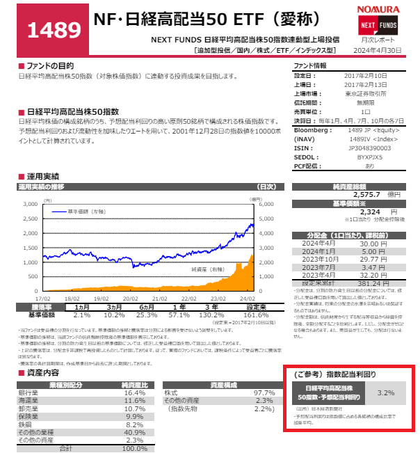【1489】日経高配当50ETFの月次レポートが公表されました。