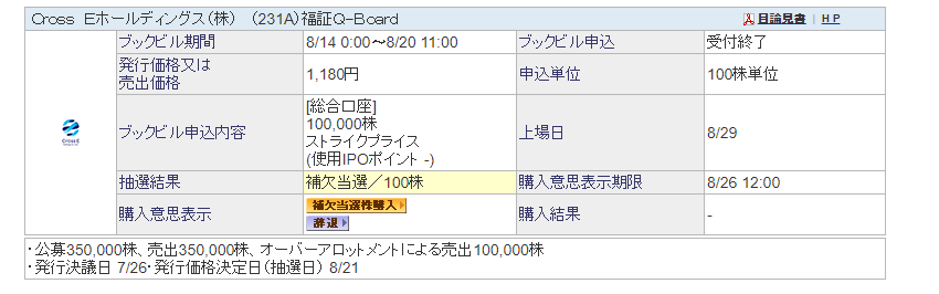 IPO銘柄のCross Eホールディングスに補欠当選しました。