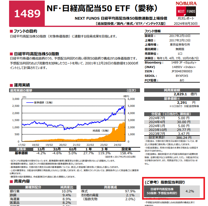 【1489】日経高配当50ETFの月次レポートによると、8月末時点の指数配当利回り(予想配当利回り)は4.2%となりました。