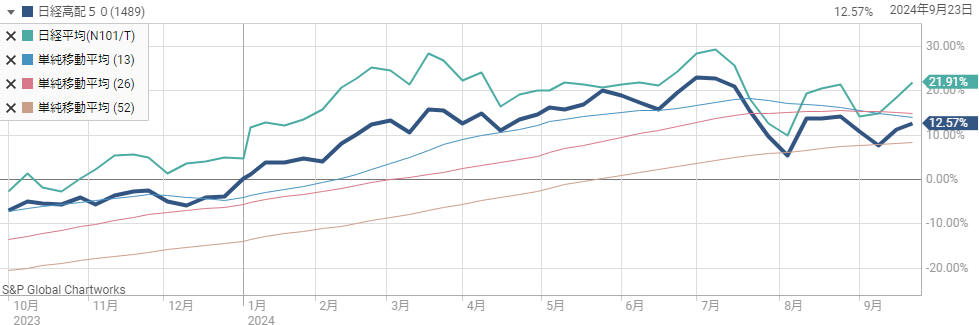 【1489】日経高配当50ETFが12%上昇に対し、日経平均株価は21%上昇と負けています。